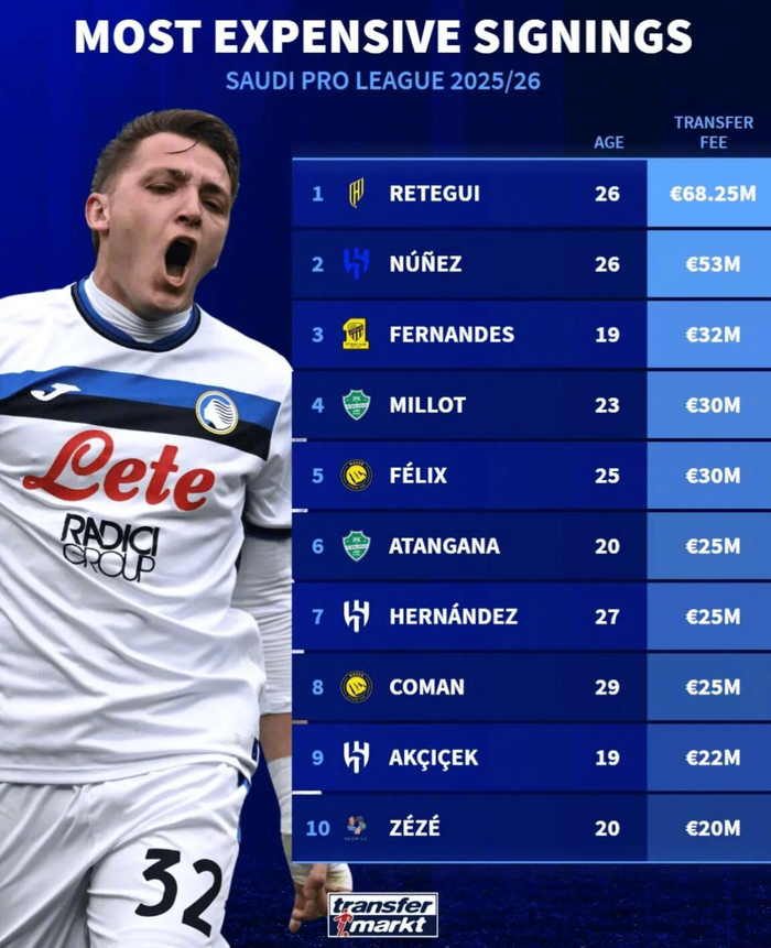 随着沙特联赛转会窗口的关闭,德转公布了2025/26赛季沙特联赛最昂贵的引援前十排行榜。利雅得新月独占三席,利雅得胜利和吉达国民各占两席紧随其后。